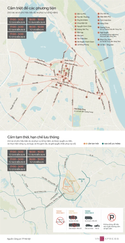 Chuẩn bị cho đại lễ A80, khoảng 100 tuyến đường Hà Nội, tập trung từ vành đai 3 trở vào bị cấm, tạm cấm và hạn chế phương tiện trong nhiều khung giờ từ 21/8 đến 2/9.